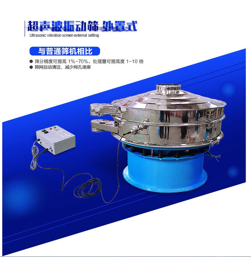 超聲波振動篩是將220V、50Hz或110V、60Hz電能轉化為36KHz的高頻電能,輸入超聲換能器,將其變成36KHz機械振動,產生的功率超聲波使篩網作高頻振動。篩網上的物料在作低頻旋振運動的同時,疊加上超聲振動,既可防止網孔堵塞,又可使篩分機提高產量和質量,從而達到快速篩分和清網的目的,使超微細粉篩分成為易事。該系統在傳統的振動篩基礎上在篩網上引入一個低振幅、高頻率的超聲振動波(機械波),以改變超微細分體的篩分性能。特別適合高附加值精細分體的用戶使用。